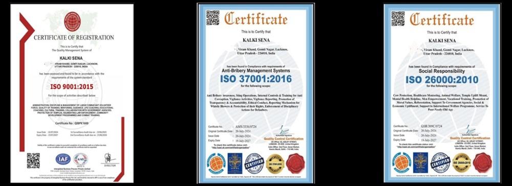 Kalki Sena has been awarded as International Organization for Standardization ( ISO ) : Certifications : ISO 9001:2015 , ISO 37001:2016 , ISO 26000:2010